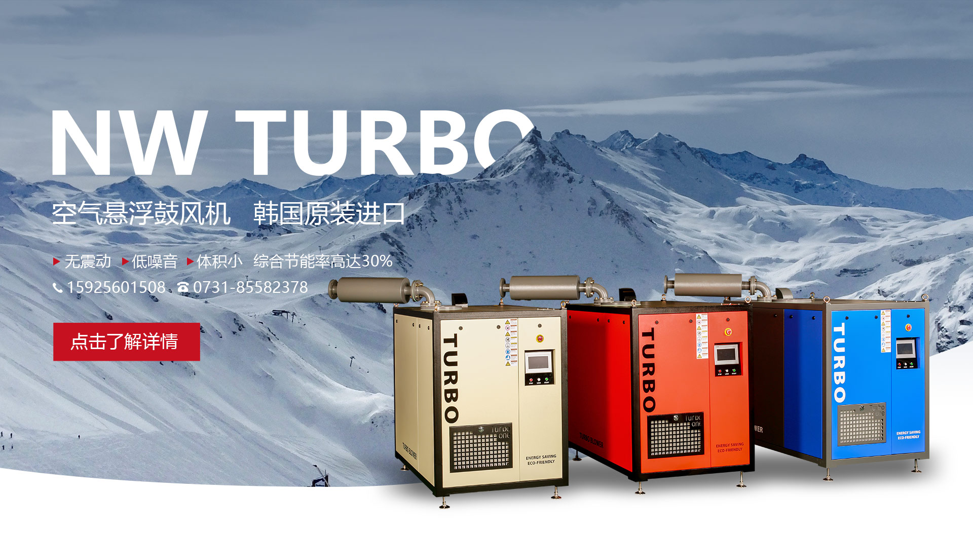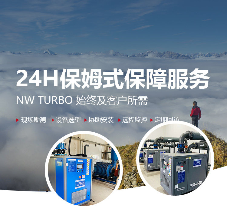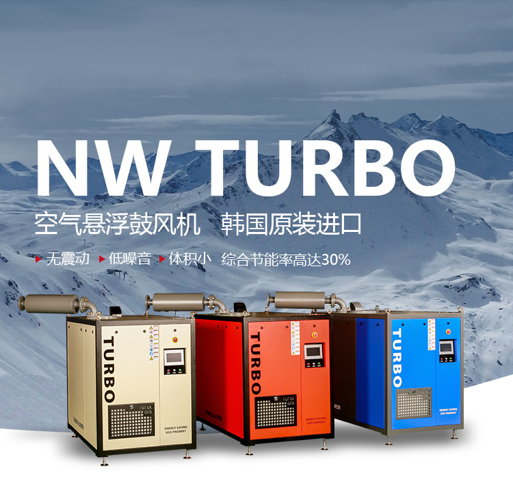 螺杆鼓风机与空气悬浮鼓风机两者之间比较有哪些各自优势呢?接下来就由NW TURBO为大家讲解:对比各自领域的产品,如罗茨鼓风机与螺杆鼓风机,单级高速、多级离心风机与空气悬浮鼓风机,螺杆鼓风机与空气悬浮鼓风机无疑在技术以及效率上都有着自己的优势。如果要对这两类新兴的产品作对比的话,这两者各自的优势领域差别也还是比较明显的。先从产品的基本特点上。两者都是清洁无油的。螺杆式鼓风机是容积式鼓风机,同样功率,无法在风量上超过离心式的空气悬浮鼓风机。因此中小型风量应用场合是螺杆鼓风机的主要应用场合,效稳定,而且可以达到比较高的压力。而空气悬浮鼓风机则可应用在单机大风量的应用场合,但由于是单级离心式,所以在